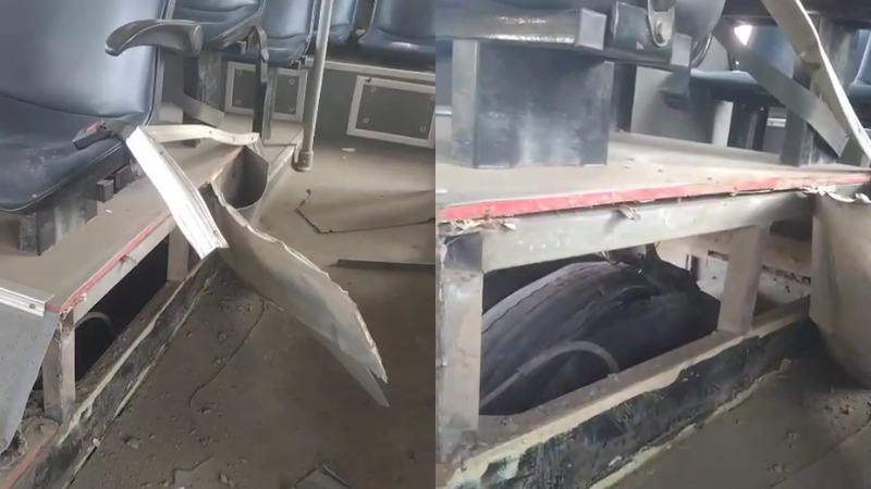 Yesterday the bus went from Atthibele to Majestic. The tire of the bus exploded. Due to this, the seat near the tire of the bus was also damaged. Also, the bottom of the bus is broken and covered with dust.