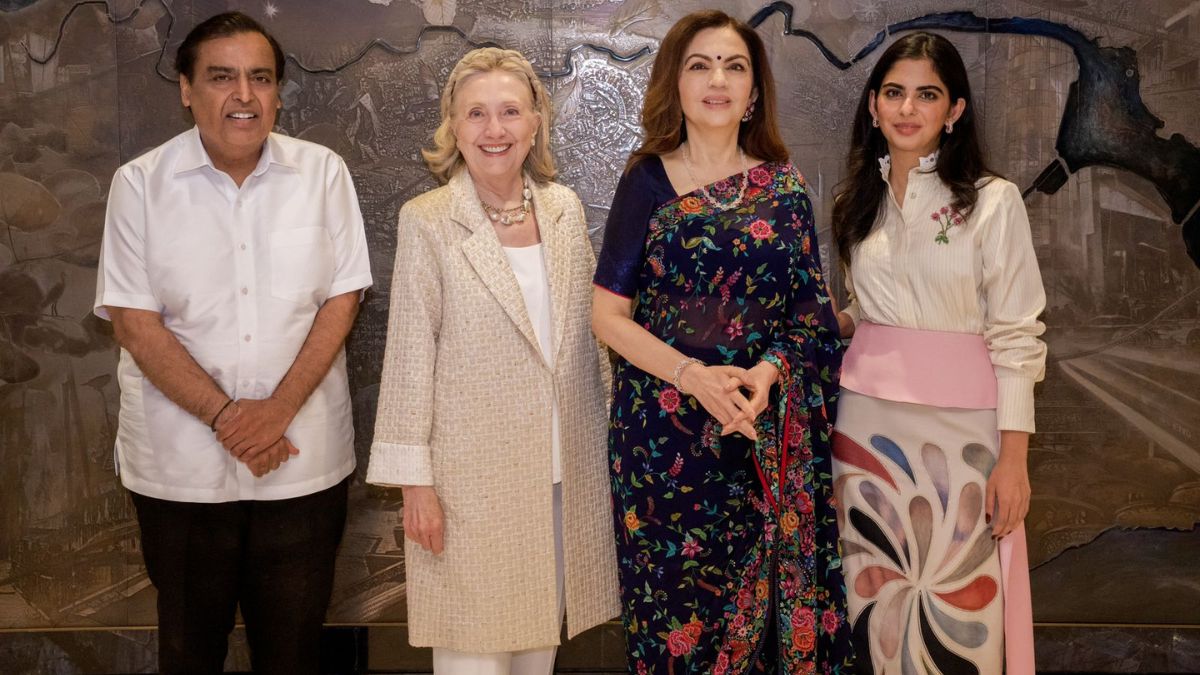 Mumbai: Reliance Industries Limited Chairman and Managing Director Mukesh Ambani and his wife and Reliance Foundation founder-chairperson Nita Ambani invited former US Secretary of State Hillary Clinton to their famous home ‘Antilia’ in Mumbai. The Ambani family’s evening with Hillary Clinton was filled with friendship, cultural exchange and discussions about the future. Mukesh and Nita Ambani were also accompanied by their daughter Isha Ambani, who is the director of Reliance Industries Limited. In this meeting, along with Indian hospitality, shared interest for art and environmental protection was also seen.